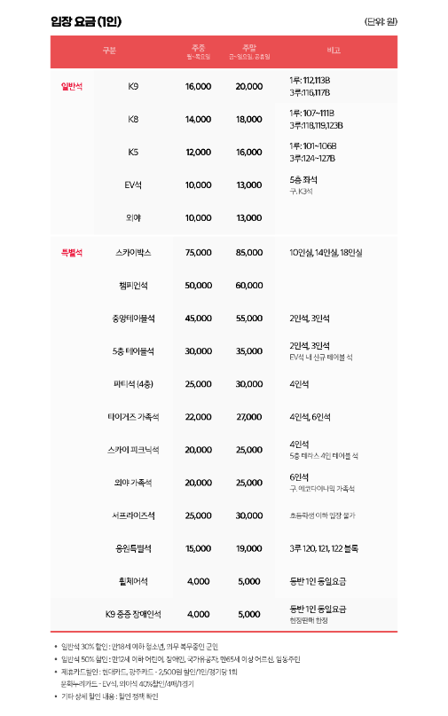 일반석: K9석, K8석, K5석, K3석, 외야석
