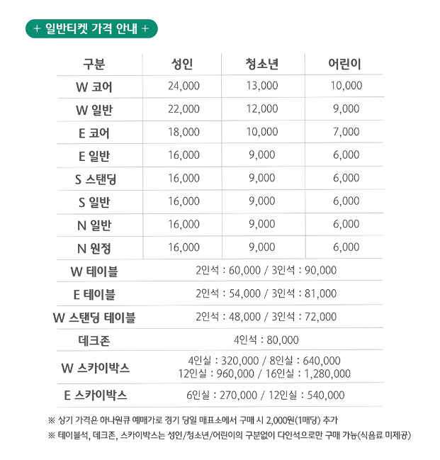 | 테이블석 / 데크존 / 스카이박스 | 48,000–1,280,000 수준 |