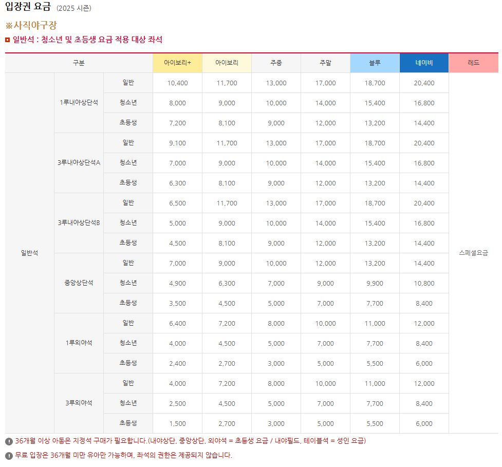 가격은 경기 일정과 좌석 위치에 따라 변동될 수 있으므로, 정확한 가격은 예매 시 확인하시기 바랍니다.