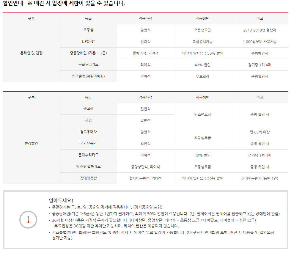 중증장애인: 휠체어석, 외야석 일반 요금 50% 할인 (증빙 확인 시)