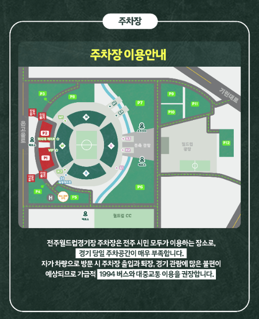 ※ 주차장은 경기장 주변에 위치하고 있으며, 경기 당일 혼잡할 수 있으므로 대중교통 이용을 권장합니다.