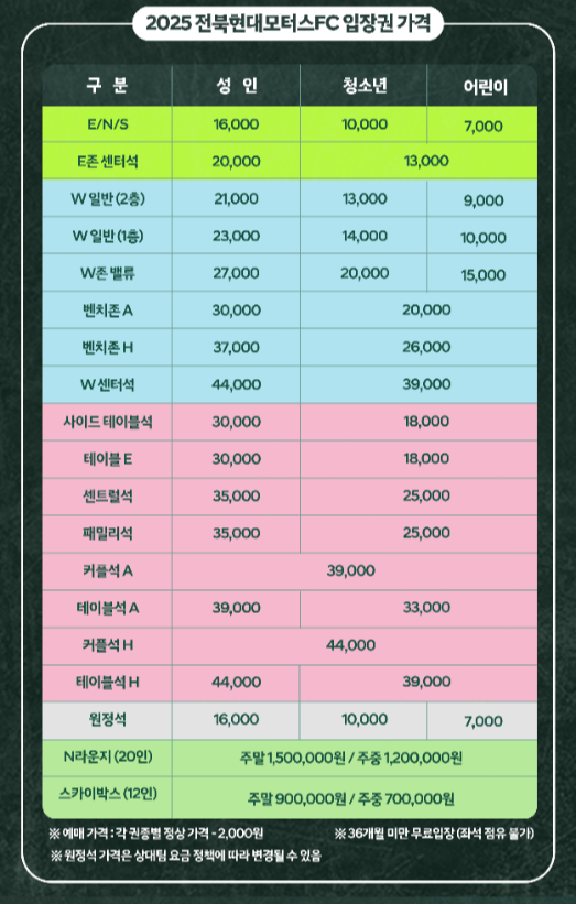 안녕하세요! 전북 현대 모터스 FC의 2025 시즌 홈경기 티켓 예매에 대해 자세히 안내해 드리겠습니다. 티켓 예매 방법부터 좌석별 가격, 할인 혜택, 예매 일정 및 오픈 시간, 좌석 배치도, 예매 시 유의사항, 주차장 정보까지 모두 포함하여 정리해 보았습니다.