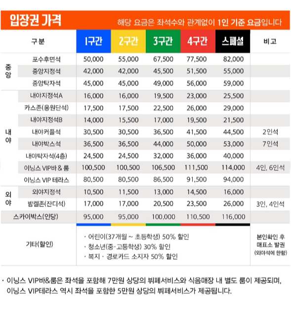 외야 지정석: 가족이나 친구들과 함께 편안하게 관람할 수 있는 좌석으로, 여유로운 분위기에서 경기를 즐길 수 있습니다.​