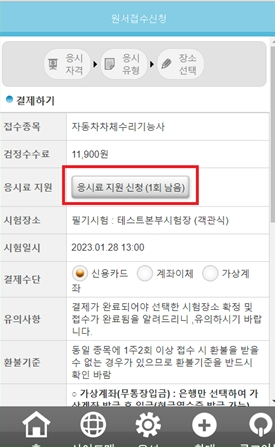 - 최종 결제 전 응시료 지원 신청 여부 선택