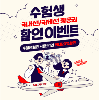 - 혜택: 국내선 모든 노선 대상 수험생 본인 및 동반자 1인까지 20% 할인