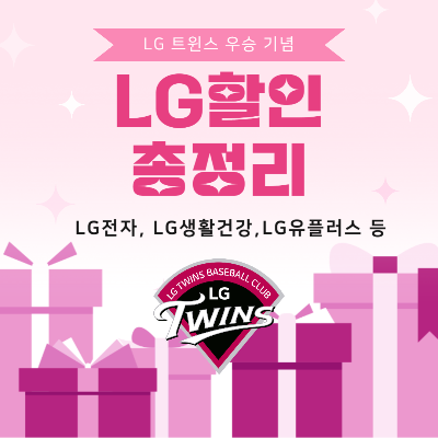 LG전자 한국시리즈 우승 기념 할인행사(LG생활건강, LG유플러스)에 대해 알아보았습니다. 29년 만에 한국시리즈에 우승한 만큼 엄청난 할인행사를 진행합니다. 그동안 사고 싶었던 품목이 있으면 이번 기회에 꼭 구매하셨으면 좋겠습니다.